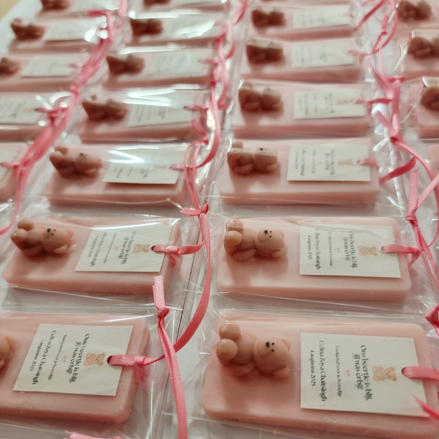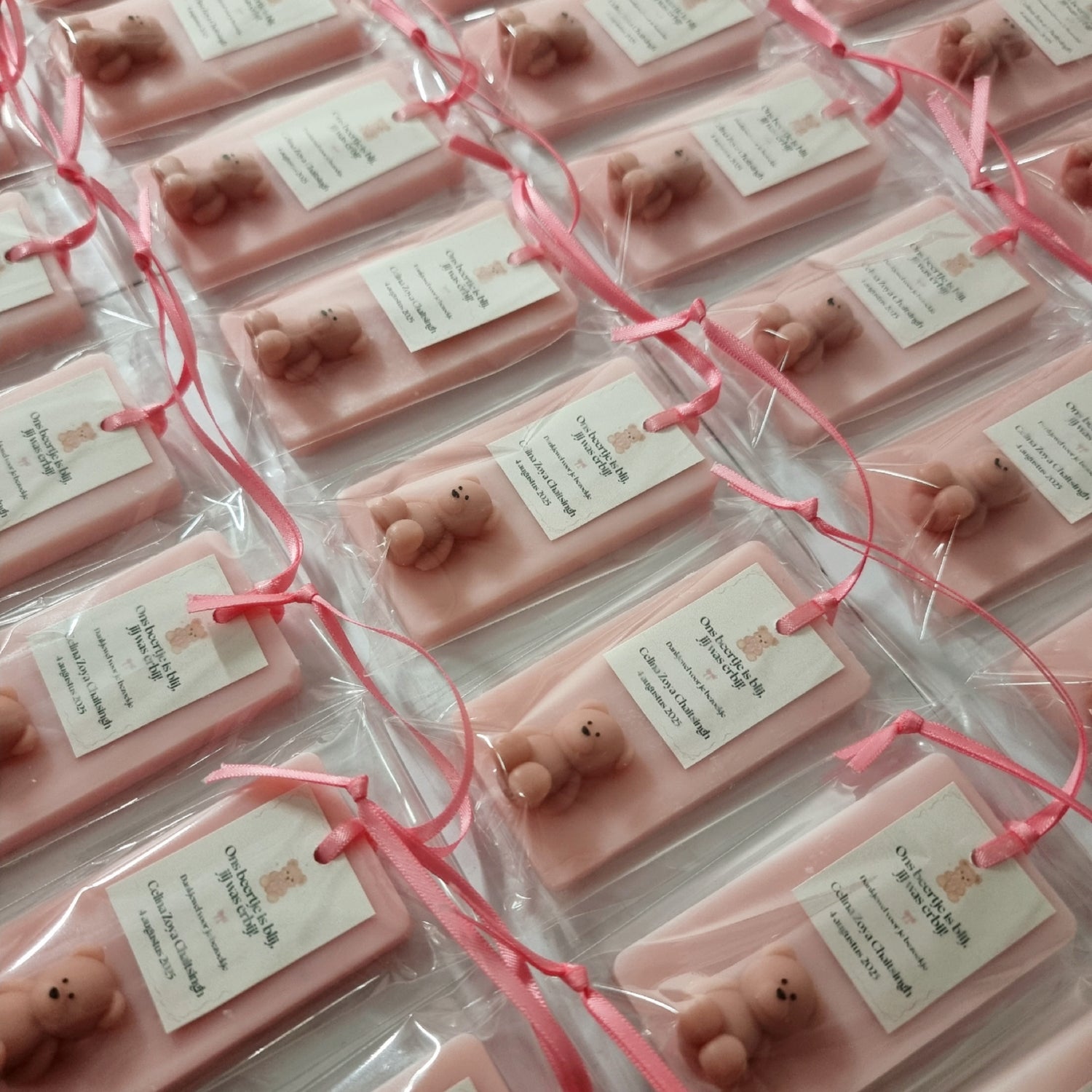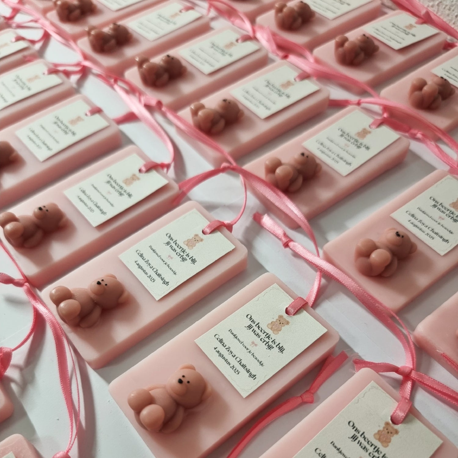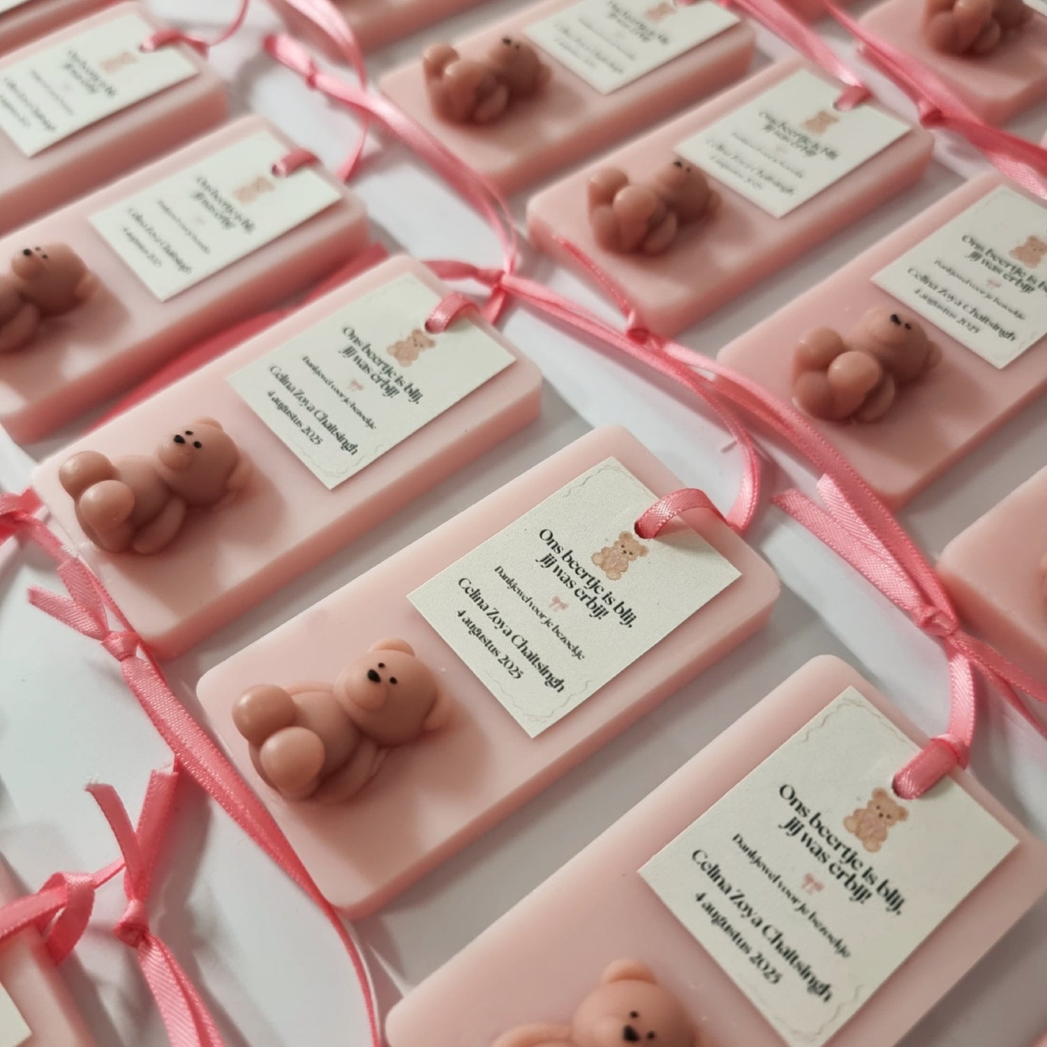 Op zoek naar een uniek en persoonlijk bedankje? Onze schattige teddy geurhangers van soja was is een perfecte keuze! Met een heerlijke babypoeder geur zorgt deze geurhanger voor een frisse en knusse sfeer in elk ruimte. Kies zelf de kleur van het lintje en de geurhanger. Voeg een persoonlijke tekst toe voor een speciale touch. Kant en klaar verpakt in een stijlvol cellofaanzakje.