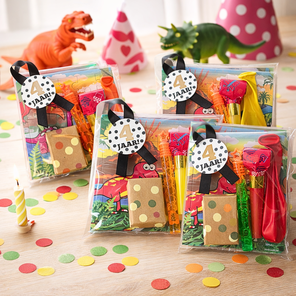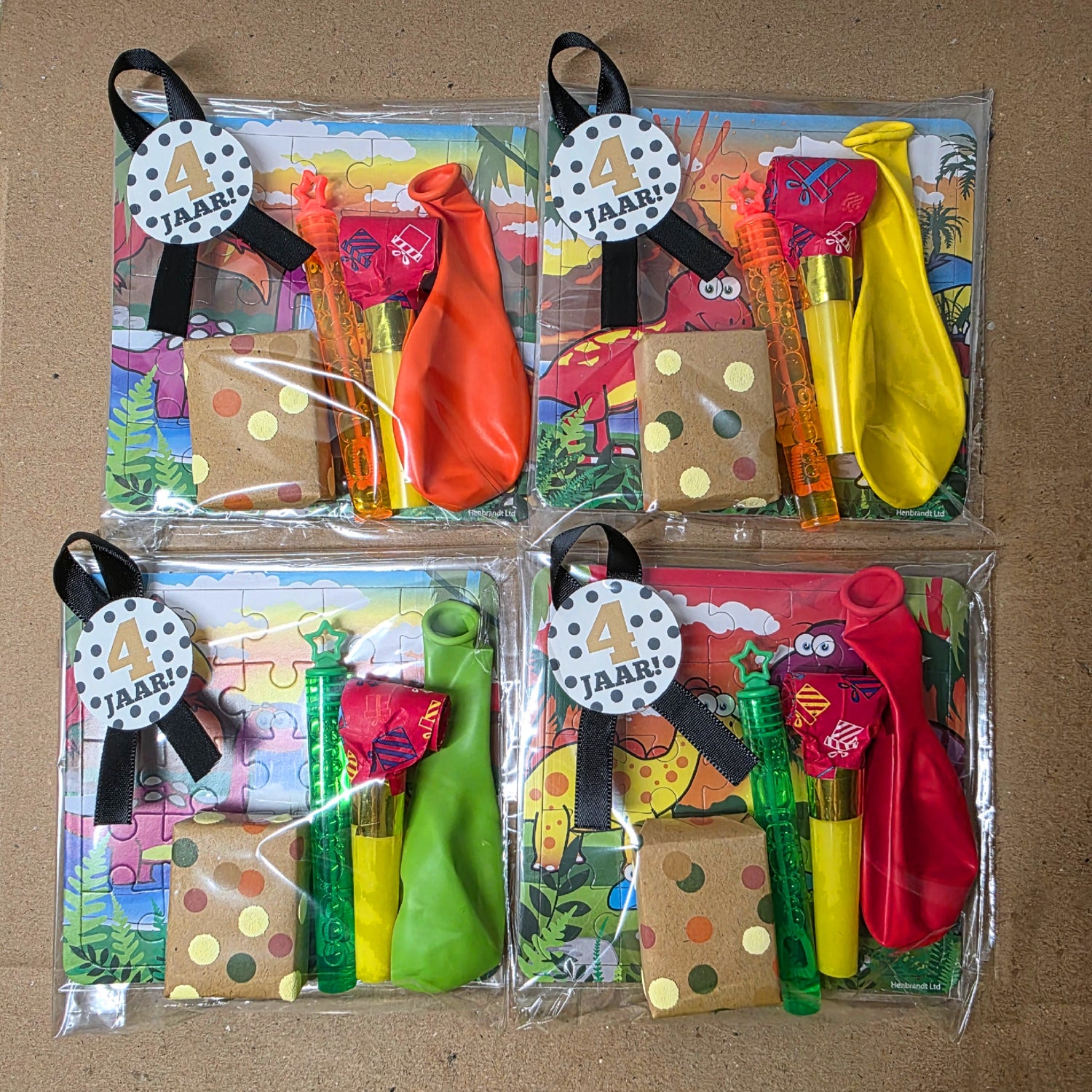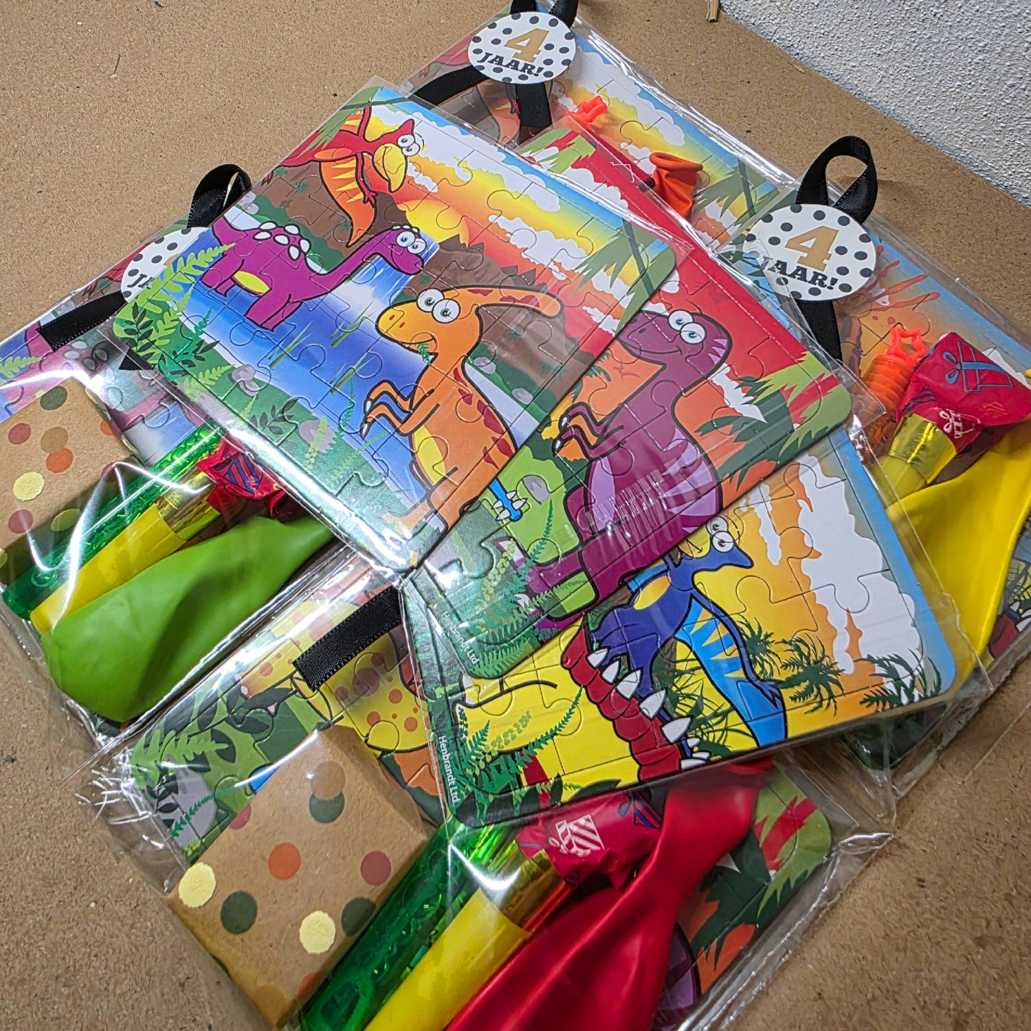 Een superleuke Dino puzzel traktatie met een stoere dino puzzel, bellenblaas, roltong, ballon en een pakje rozijntjes. Feestelijk verpakt in dino thema en optioneel met confetti in het zakje voor een extra feestelijke touch. Ideaal als schooltraktatie voor echte dino-liefhebbers!